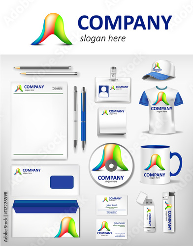 Corporate Green And Blue Identity Template Realistic Cup Business Card Letterhead Envelope Usb Stick Pen Lighter T Shirt Hat Abstract Vector Company Professional Style For Brand Book Buy This Stock Vector And Explore