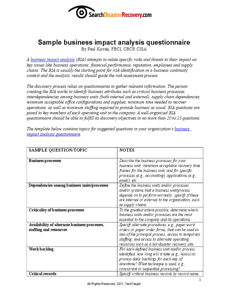 Searchdisasterrecovery Business Impact Analysis Questionnaire Business Process Disaster Recovery